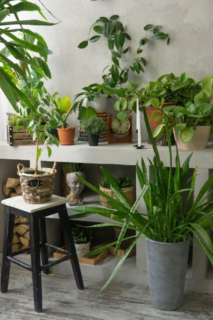 A collection of various healthy indoor plants arranged in a bright living room with natural light.