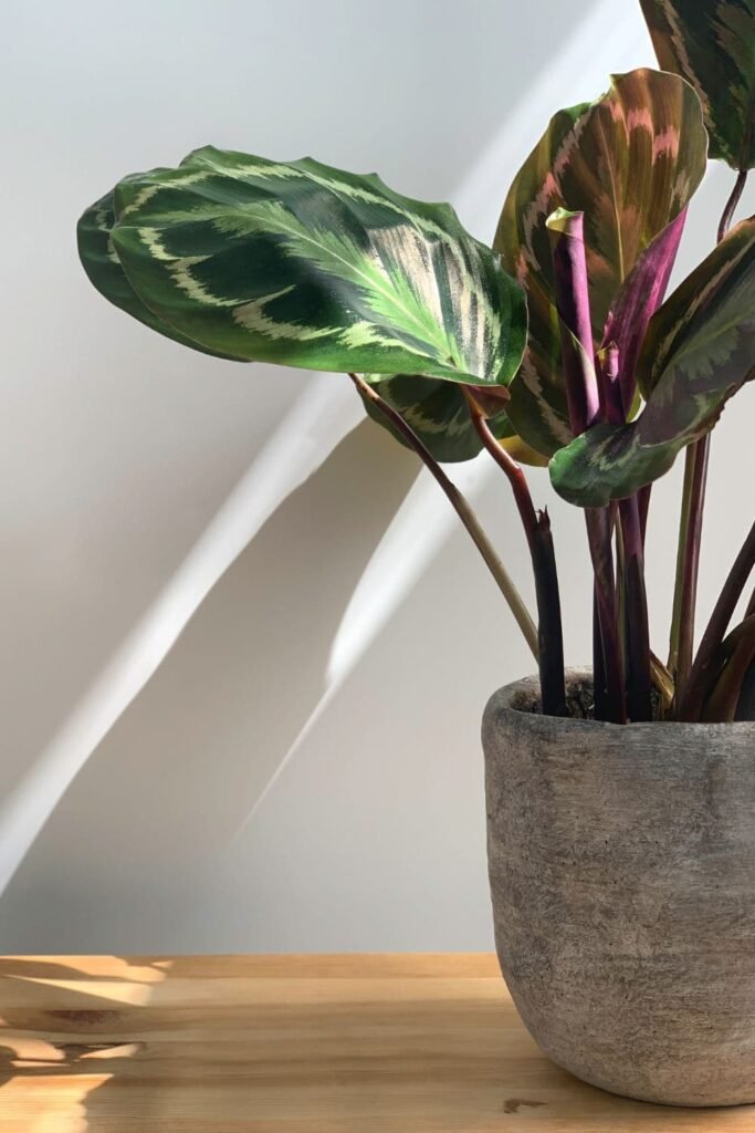Calathea is a tropical plant known for its striking, patterned leaves that move throughout the day. It thrives in bright, indirect light but can tolerate lower light levels, making it suitable for many indoor spaces.