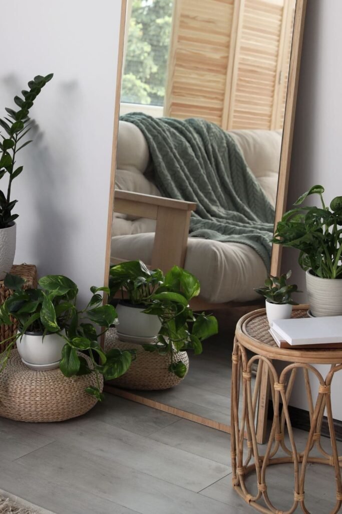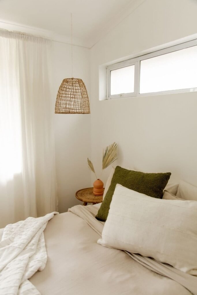 From hanging pothos to potted snake plants, greenery breathes life into an earthy bedroom. Plus, indoor plants help purify the air.