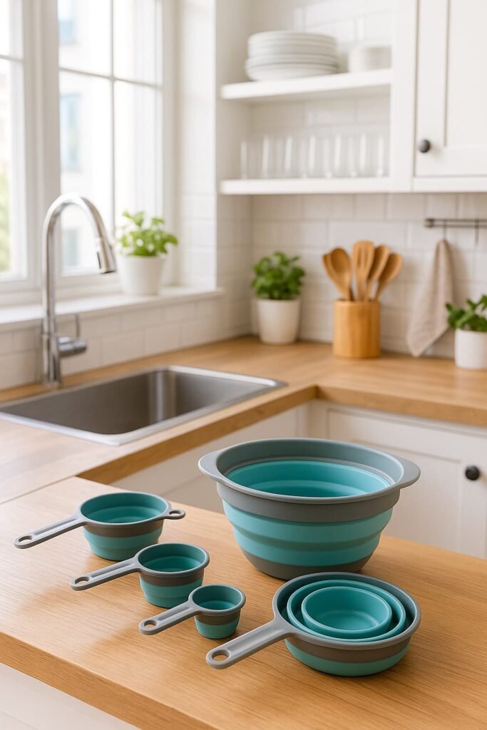Bulky kitchen tools can eat up precious cabinet space, but collapsible measuring cups and mixing bowls solve the problem beautifully. Designed for small apartment kitchens, they flatten down to just a few inches when not in use — meaning you’ll actually have room for your pantry staples. These renter-friendly essentials are lightweight, practical, and perfect for anyone trying to keep a tiny kitchen organized.