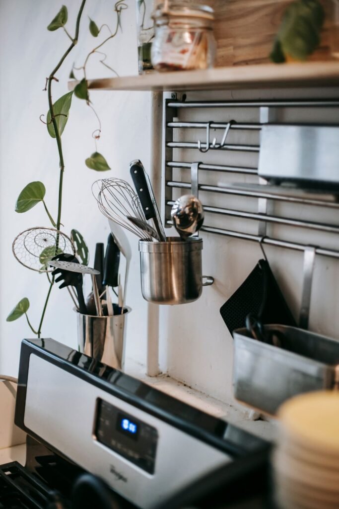 You can use a pegboard to organize utensils and cookware efficiently. Mount it on an empty wall to turn unused vertical space into practical storage.