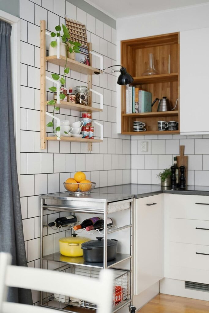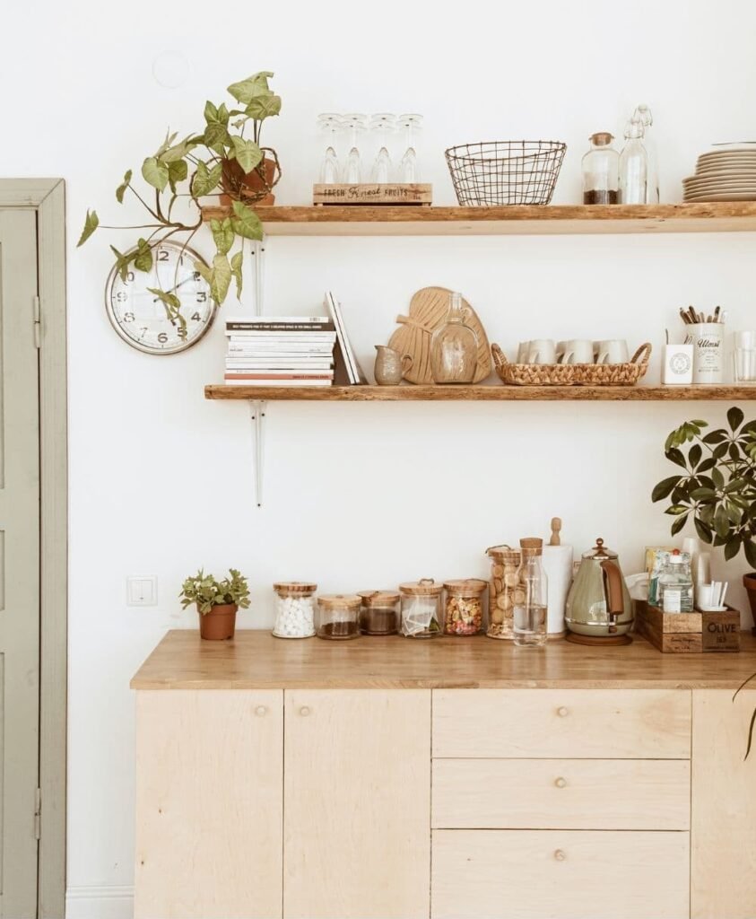 You can arrange items like plates, mugs, and spices on these shelves for quick access. Choosing floating shelves at varied heights also adds a visual element without overwhelming your small kitchen.