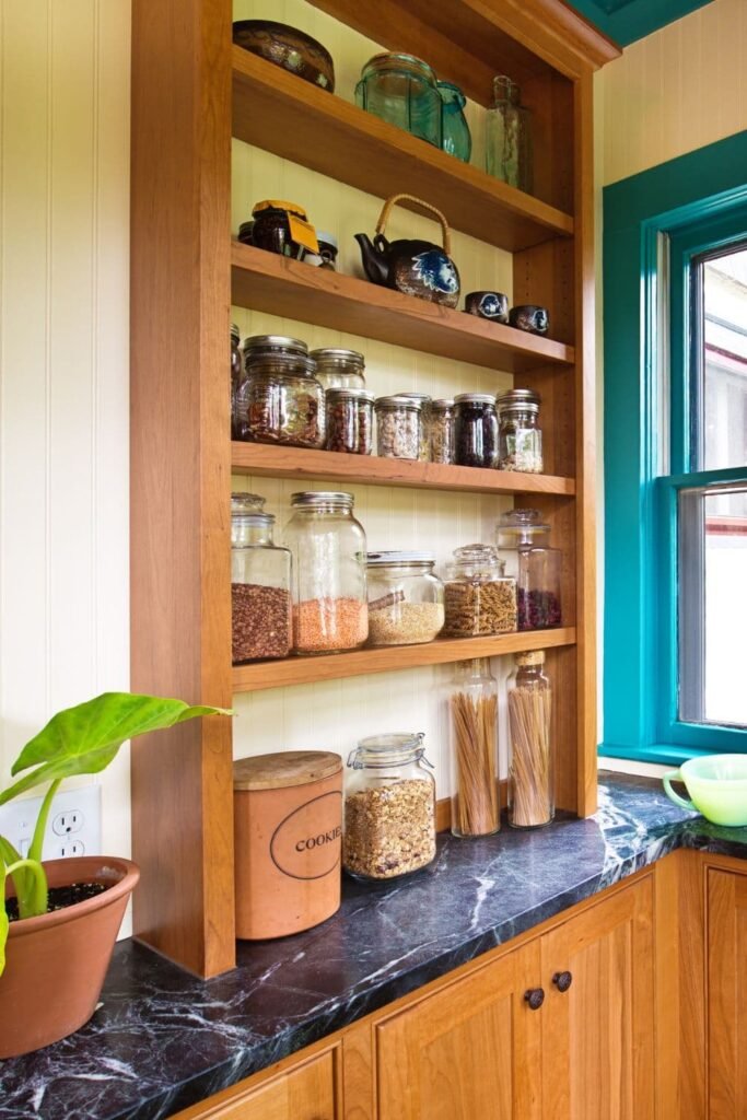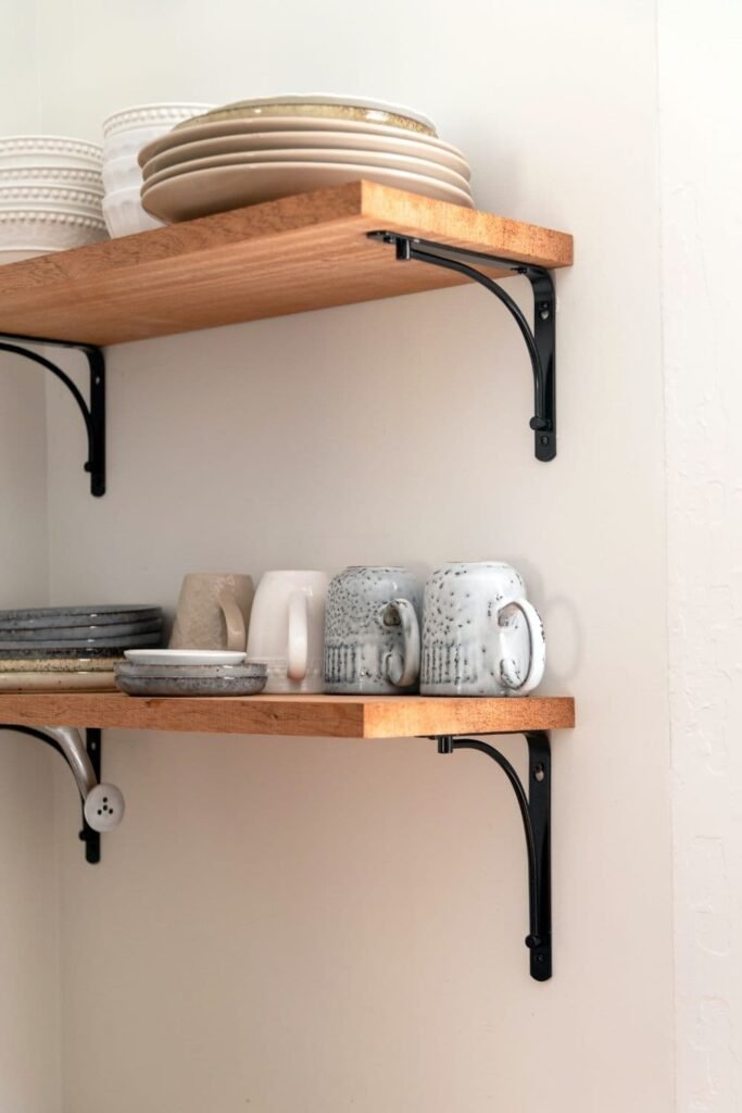 Open shelves let you keep everyday kitchen essentials within easy reach. This reduces clutter on counters and in cabinets, making your space feel more organized.